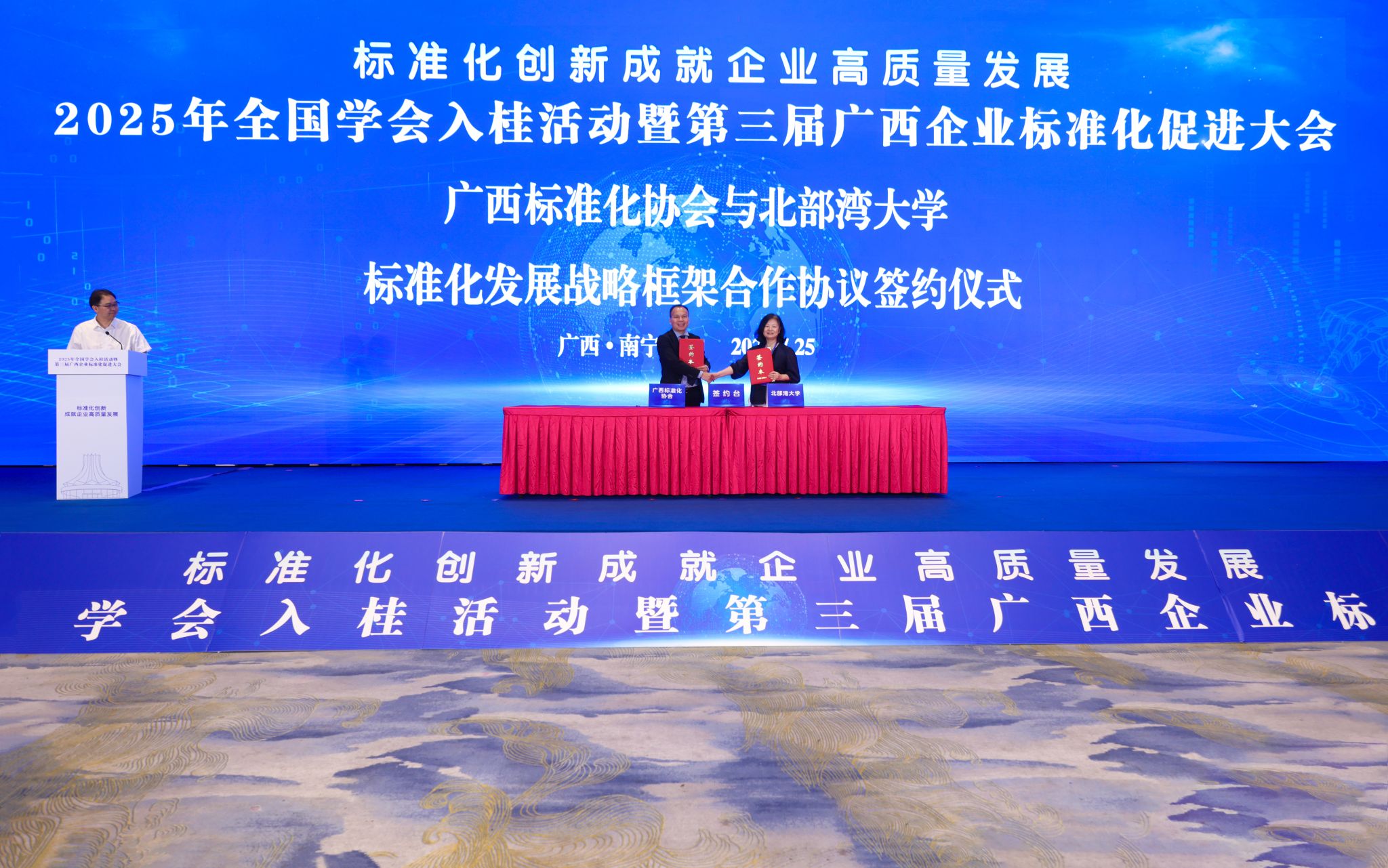 7月25日,2025年全国学会入桂活动暨第三届广西企业标准化促进大会在南宁隆重召开。我校党委常委、副校长陈丹教授受邀出席大会,并代表学校与广西标准化协会谢宏昭会长正式签署校会发展战略框架合作协议。此举标志着我校在深化应用型大学内涵建设、服务地方经济社会高质量发展方面迈出坚实一步。