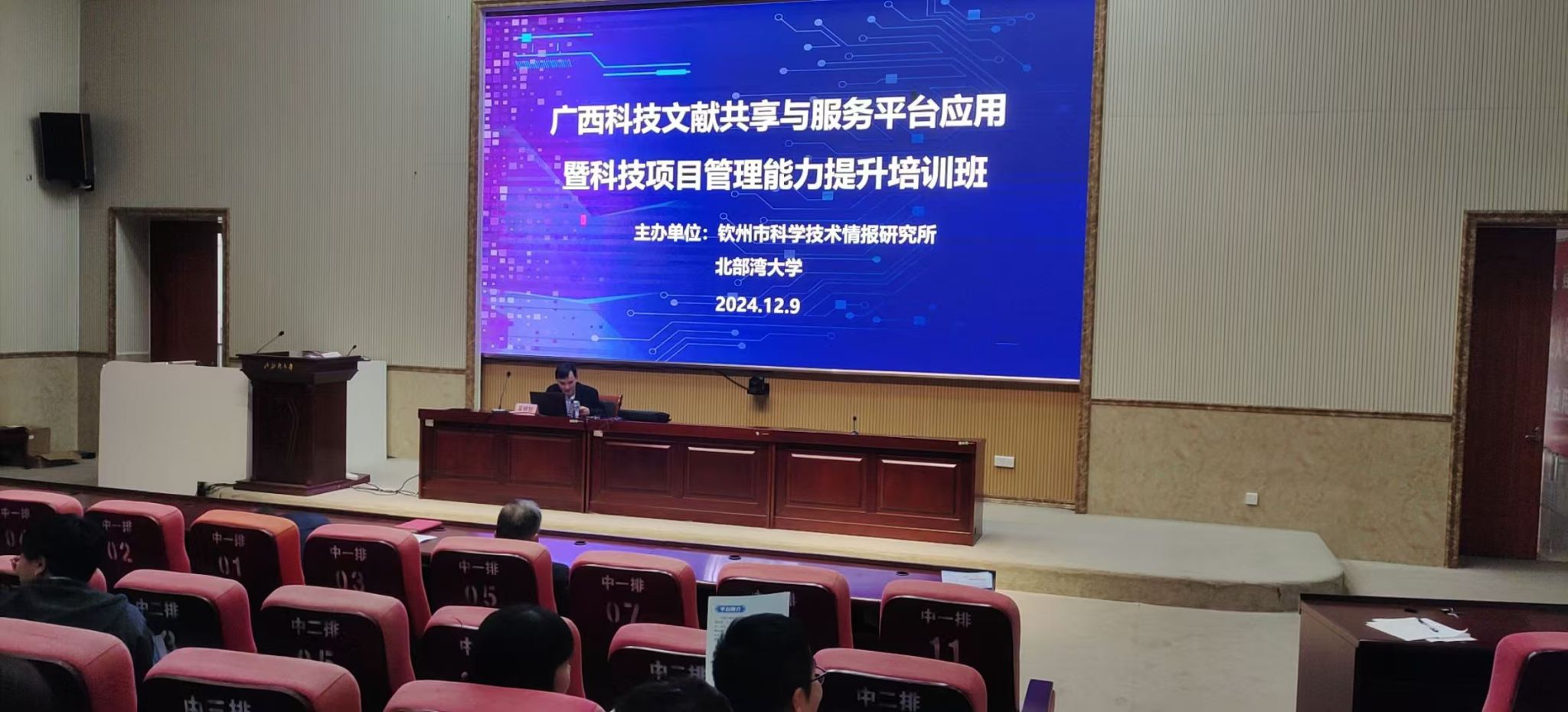 2024年12月9日,为进一步提升科研人员科技服务能力,学校与钦州市科学技术情报研究所在12栋教学楼204报告厅联合举办“广西科技文献共享与服务平台应用暨科技项目管理能力提升培训班”。钦州市科技局副局长方农业、学校科技处处长许尤厚出席。