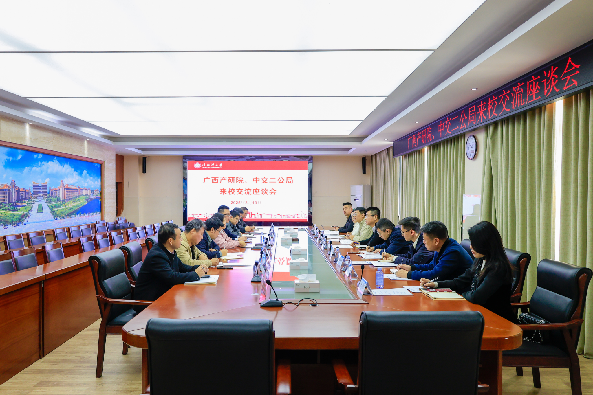 3月19日上午,广西产研院人工智能与大数据应用研究所、广西产研院绿色低碳技术研究所、中交二公局第七工程有限公司、广西产研金潮科技有限公司联合调研组来校调研交流。校党委常委、副校长陈丹出席座谈会。