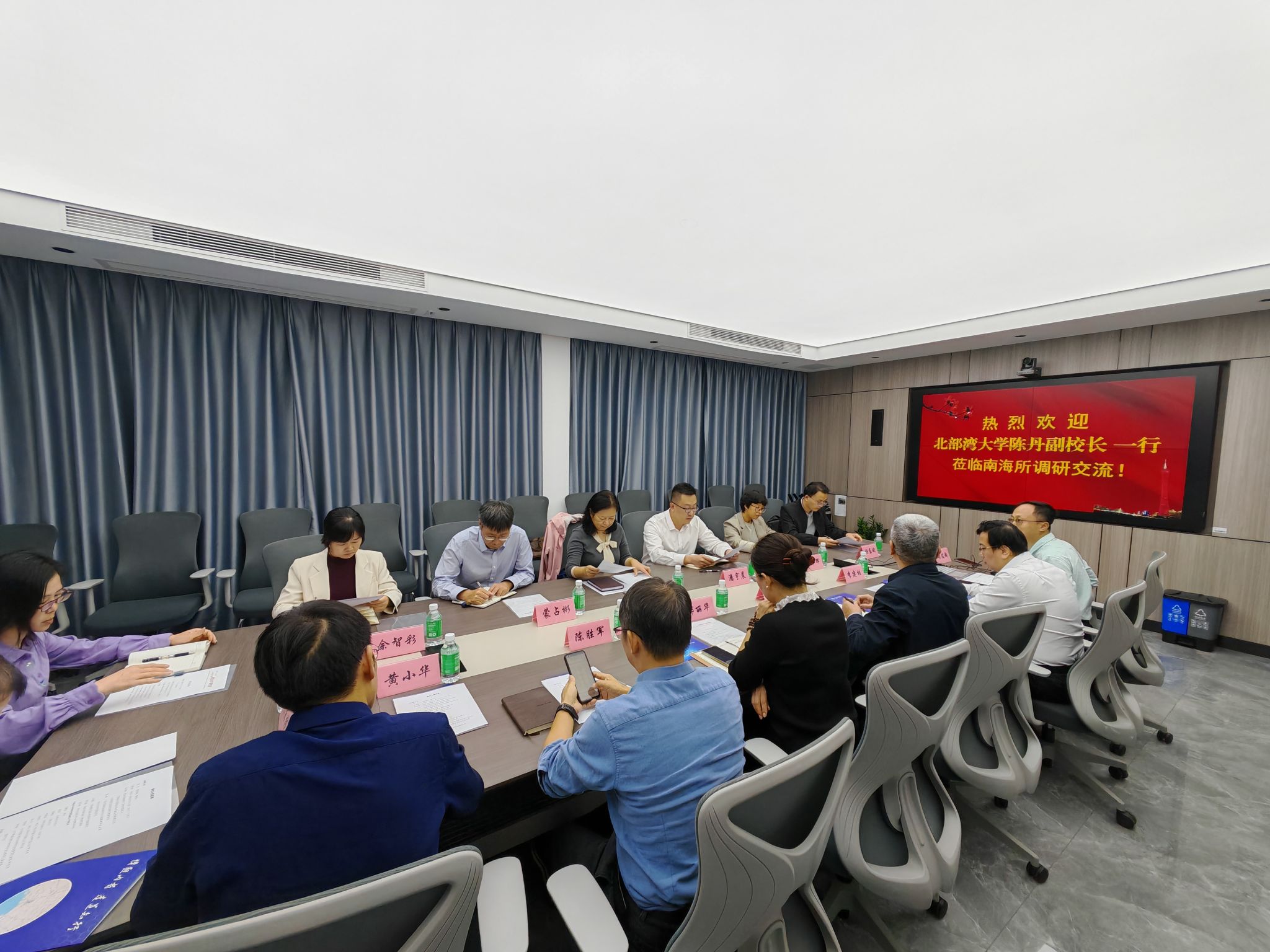 在中国水产科学研究院南海水产研究所,所长张殿昌介绍了该所的发展定位及在海上牧场全链条技术创新与产业赋能方面的成果。陈丹重点介绍了我校在水产养殖领域的布局及北部湾现代海洋牧场研究院的研究进展,希望双方依托各自区位与科研优势,通过“两湾”联动机制加强海水养殖全产业链科技创新合作。