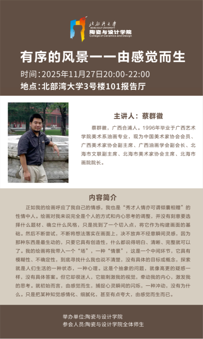 蔡群徽,广西合浦人。1996年毕业于广西艺术学院美术系油画专业,现为中国美术家协会会员、广西美术家协会副主席、广西油画学会副会长、北海市文联副主席、北海市美术家协会主席、北海市画院院长。